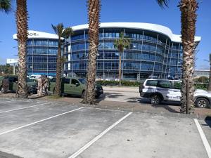 Estas patrullas han desinfectado zonas de paso de personas del polígono de Palmones como las entradas de los diferentes supermercados que existe, así como la zona del Hospital Quiron.
