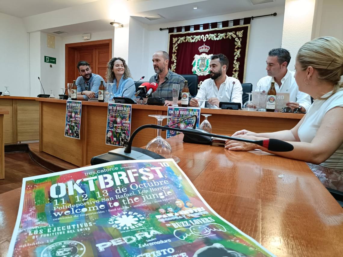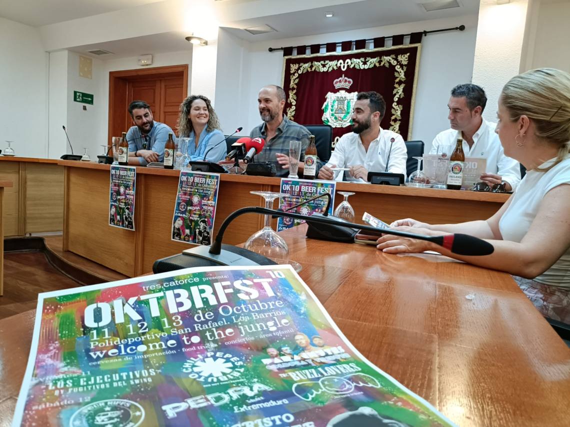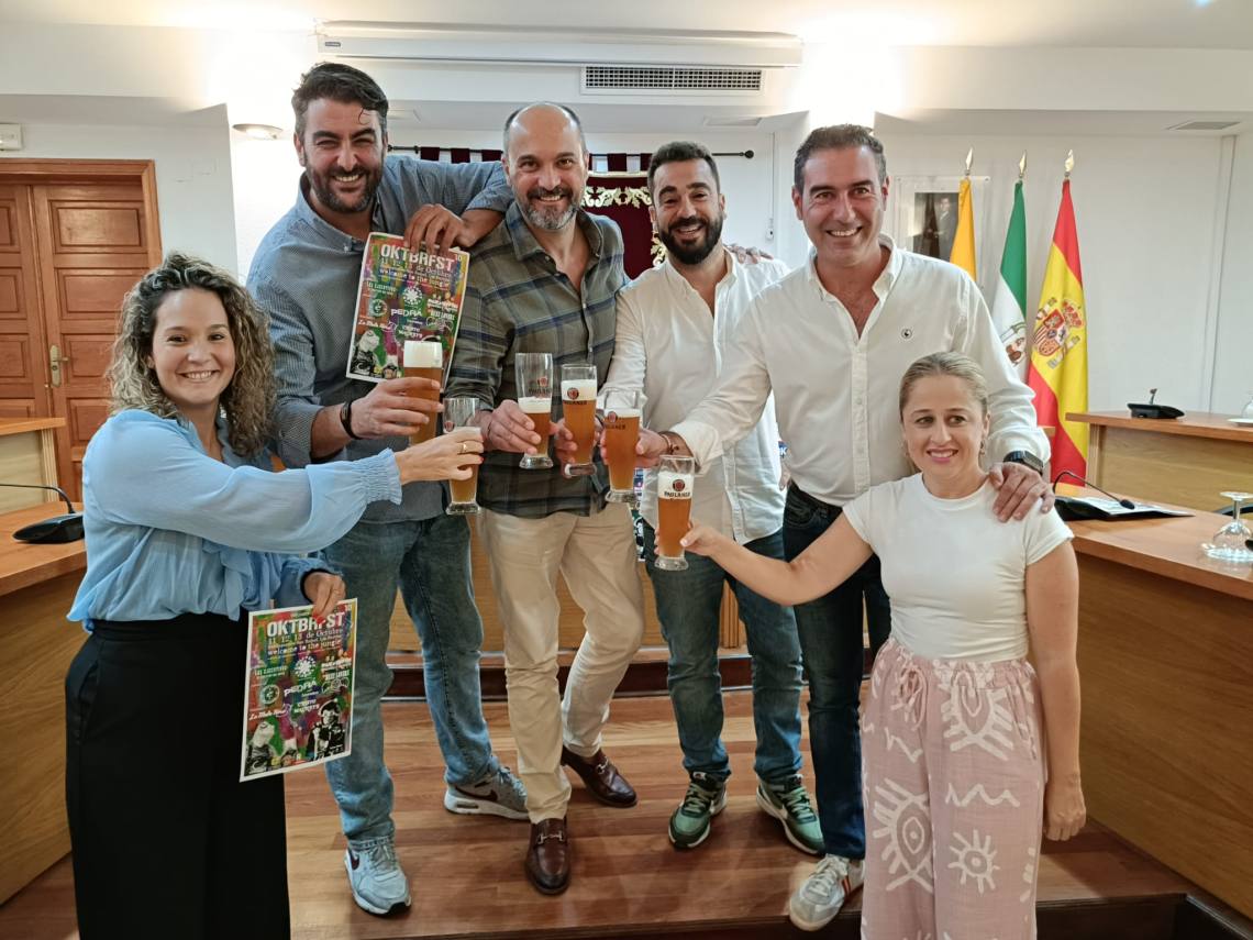 El alcalde de Los Barrios, Miguel Alconchel; la delegada de Participación Ciudadana, Sara Lobato; el concejal de Turismo, Pablo García; junto al presidente de la asociación Círculo de Amigos ‘Tres Catorce’, Miguel Jiménez Negrete, y su vicepresidente de la asociación Salvador Pérez Prieto; han presentado este mediodía la décima edición del Oktoberfest de Los Barrios, la fiesta de la cerveza, que se celebrará los días 11, 12 y 13 de octubre.