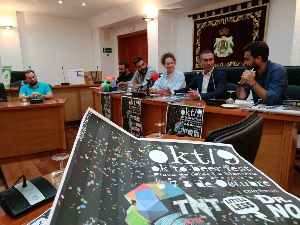 La delegada de Participación Ciudadana, Sara Lobato; el concejal de Turismo, Pablo García; y el edil de Festejos, Daniel Pérez Cumbre; junto al presidente de la asociación Círculo de Amigos ‘Tres Catorce’, Miguel Jiménez Negrete, han presentado esta mañana la novena edición del Oktoberfest de Los Barrios, la fiesta de la cerveza, que se celebrará los días 6, 7 y 8 de octubre, una edición que regresa a la plaza de toros de La Montera.