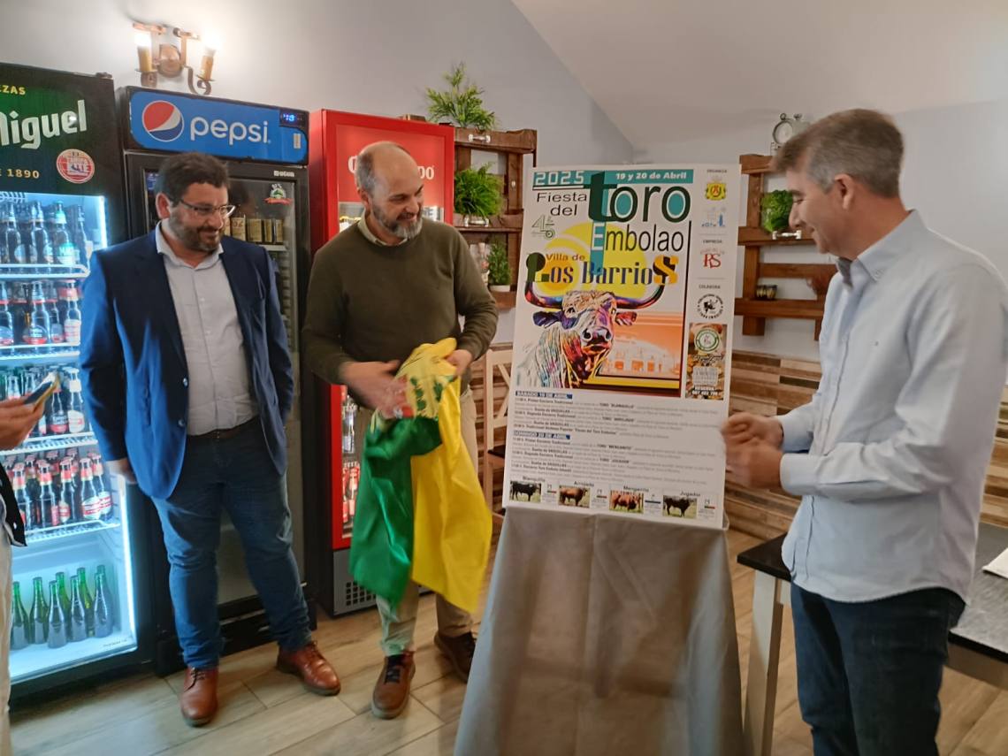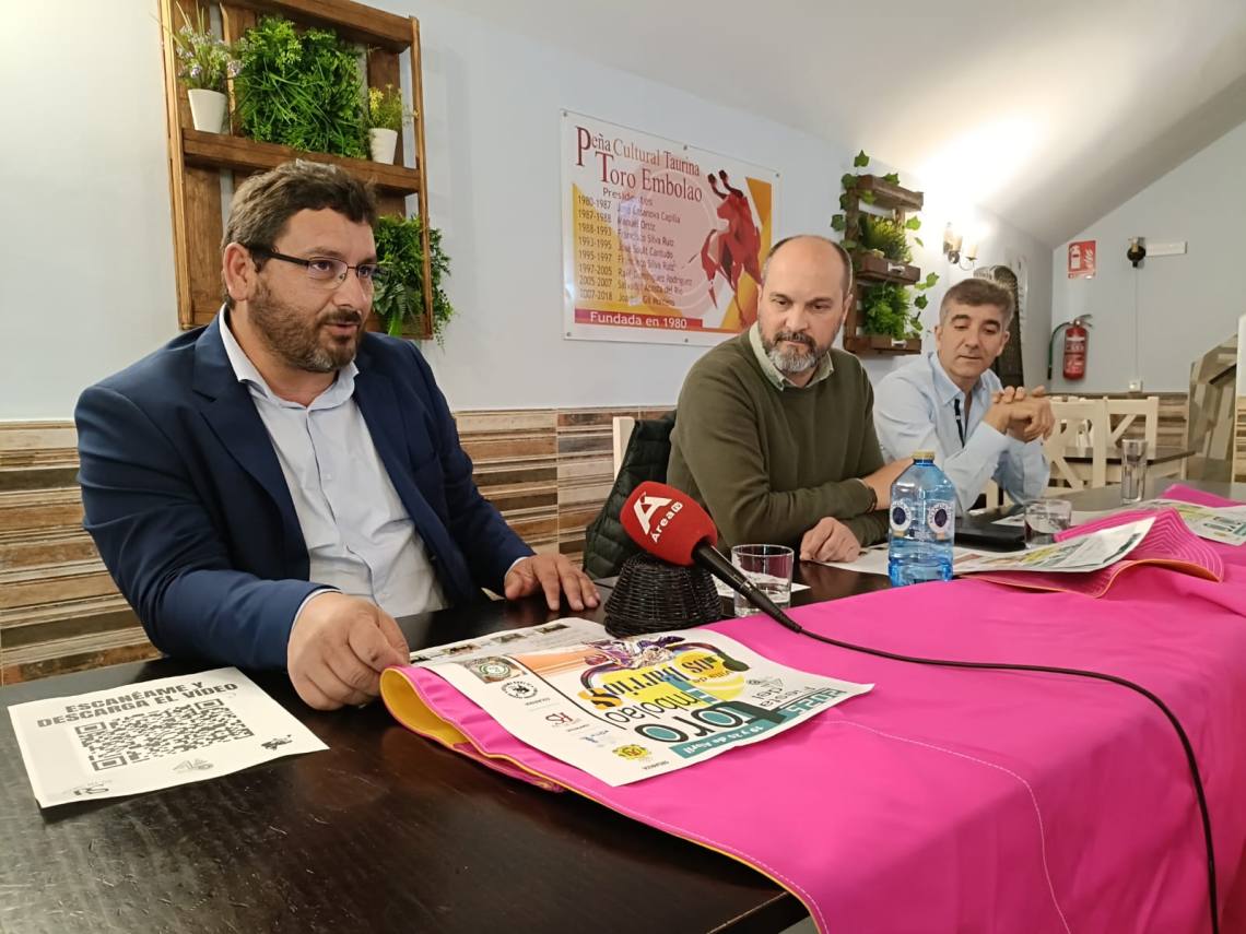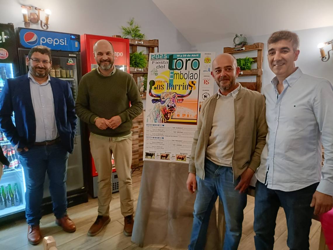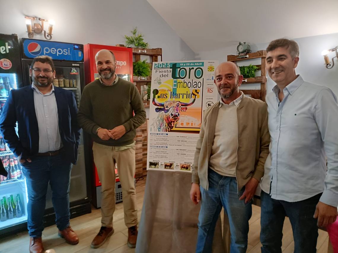 El alcalde de Los Barrios, Miguel Alconchel; el presidente de la Peña Toro Embolao, Joaquín Gil; el empresario de Ruedos del Sur, Jesús Santana; han presentado esta tarde en la sede de la entidad, situada en la plaza de toros, el cartel y toda la programación de la Fiesta del Toro Embolao 2025, que se celebrará el sábado 19 y domingo 20 de abril.