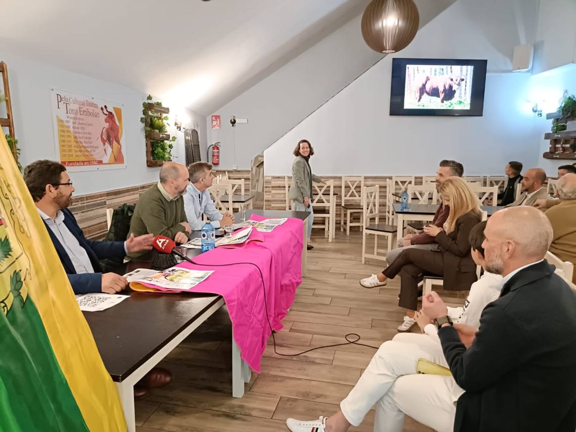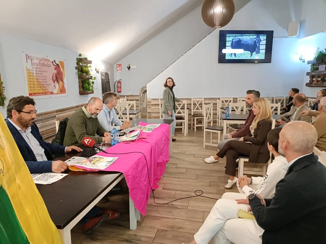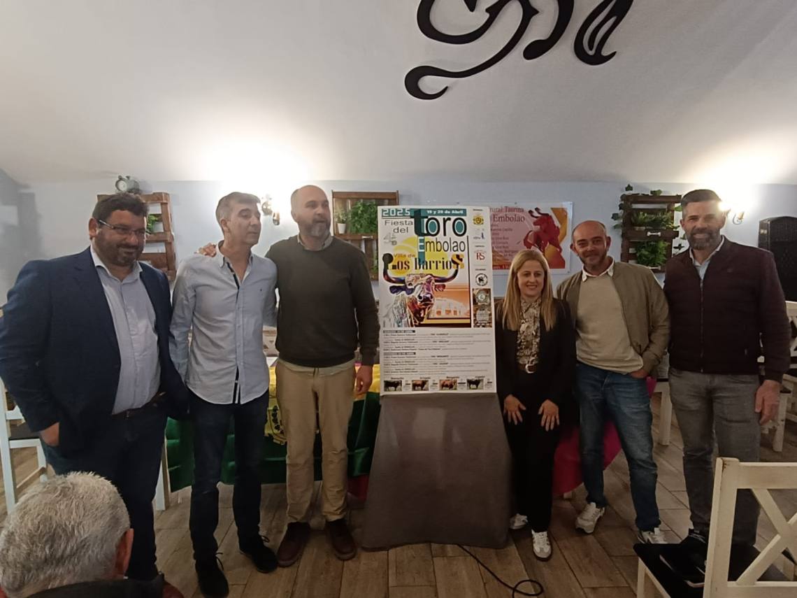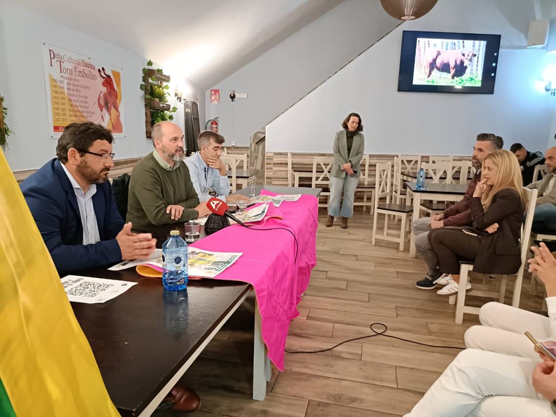 El alcalde de Los Barrios, Miguel Alconchel; el presidente de la Peña Toro Embolao, Joaquín Gil; el empresario de Ruedos del Sur, Jesús Santana; han presentado esta tarde en la sede de la entidad, situada en la plaza de toros, el cartel y toda la programación de la Fiesta del Toro Embolao 2025, que se celebrará el sábado 19 y domingo 20 de abril.