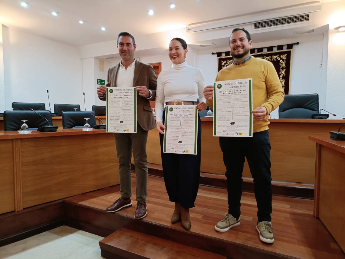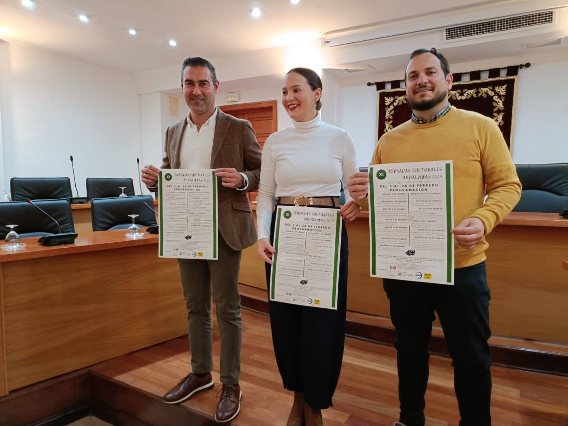 La delegada de Participación Ciudadana, Sara Lobato; el concejal de Turismo, Pablo García; y el delegado de Festejos, Daniel Pérez Cumbre; han presentado la programación de las XI Jornadas Culturales Andaluzas, que se desarrollarán en el municipio del 3 al 28 de febrero.