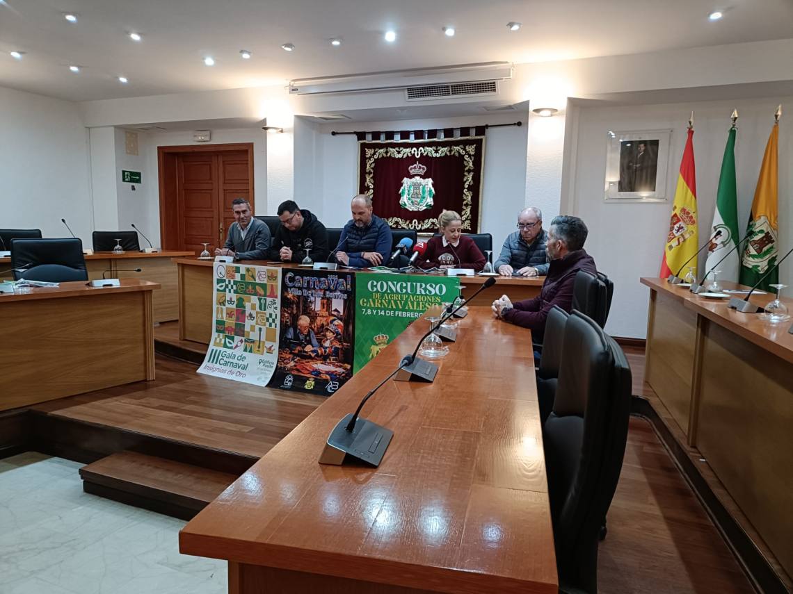 El alcalde de Los Barrios, Miguel Alconchel; el vicepresidente de Cultura de la Mancomunidad, Pablo García; la concejala de Ferias y Fiestas, May Gallego; el edil delegado de Palmones, José Antonio Gómez; han presentado esta mañana la programación del Carnaval 2026 en el municipio de Los Barrios.