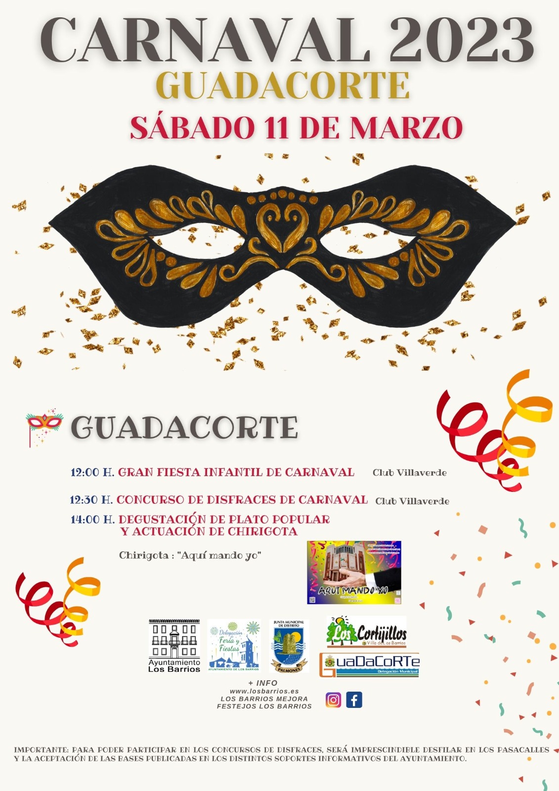También el sábado 11 de marzo Guadacorte vivirá su carnaval con una gran fiesta infantil en el club Villaverde a las 12.00h; luego se celebrará un concurso de disfraces y a partir de las 14.00h habrá una degustación de plato popular y la actuación de la chirigota ‘Aquí mando yo’.