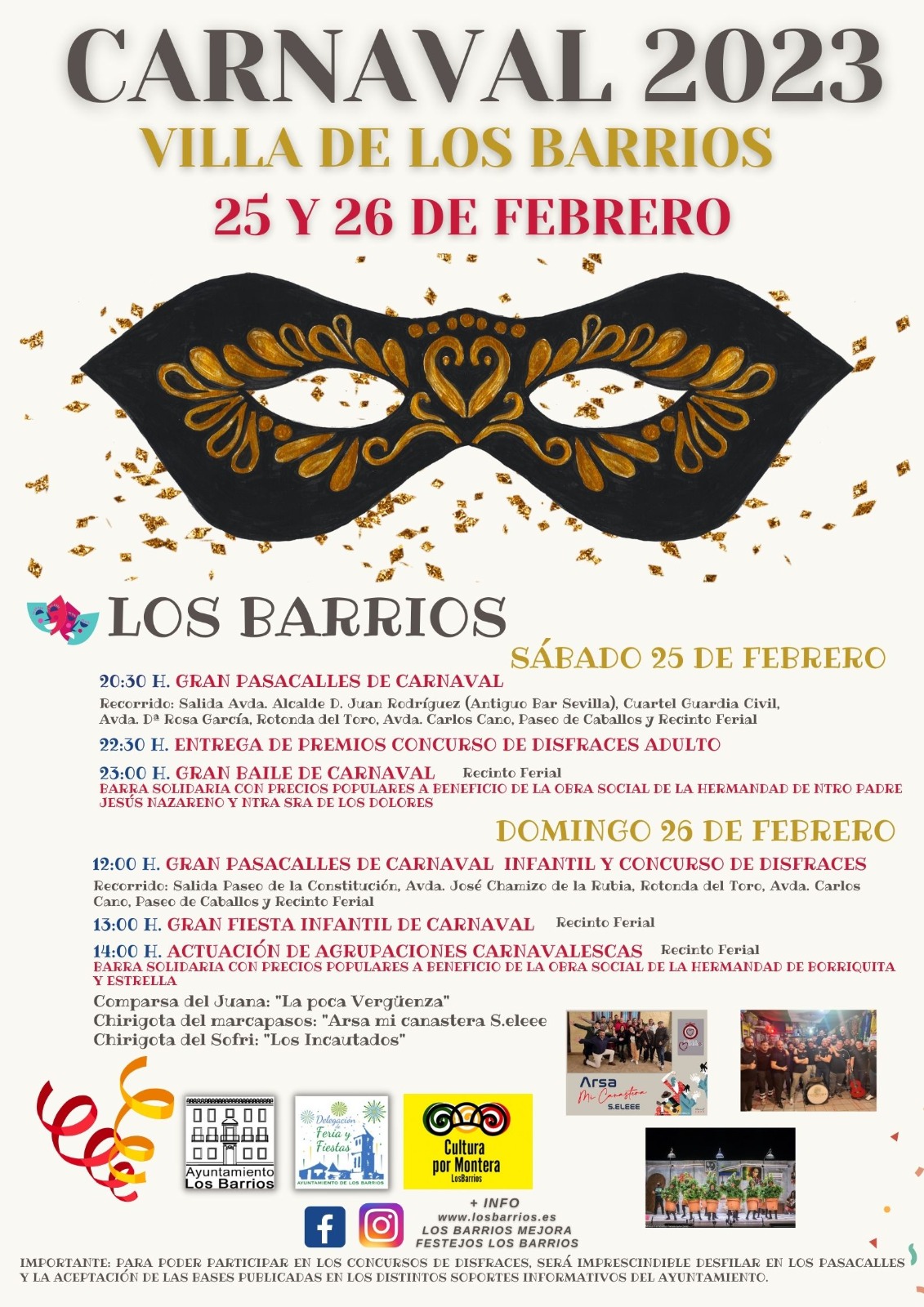 En Los Barrios el Carnaval arranca el sábado 25 a las 20.00 horas se celebrará el pasacalle de disfraces que saldrá desde la avenida don Juan Rodríguez (antiguo Bar Sevilla), hasta el recinto ferial, pasando por la avenida Doña Rosa y Carlos Cano.