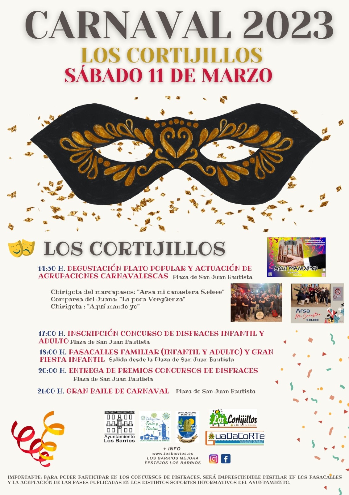 El Carnaval de Los Cortijillos se celebrará el sábado, 11 de marzo, donde a partir de las 14.30h habrá una degustación de plato popular y la actuación de diferentes agrupaciones. Estará la chirigota ‘Aquí mando yo’; la comparsa del Juana ‘La poca vergüenza’, la chirigota del marcapasos ‘Arsa mi canastera Selee’.
