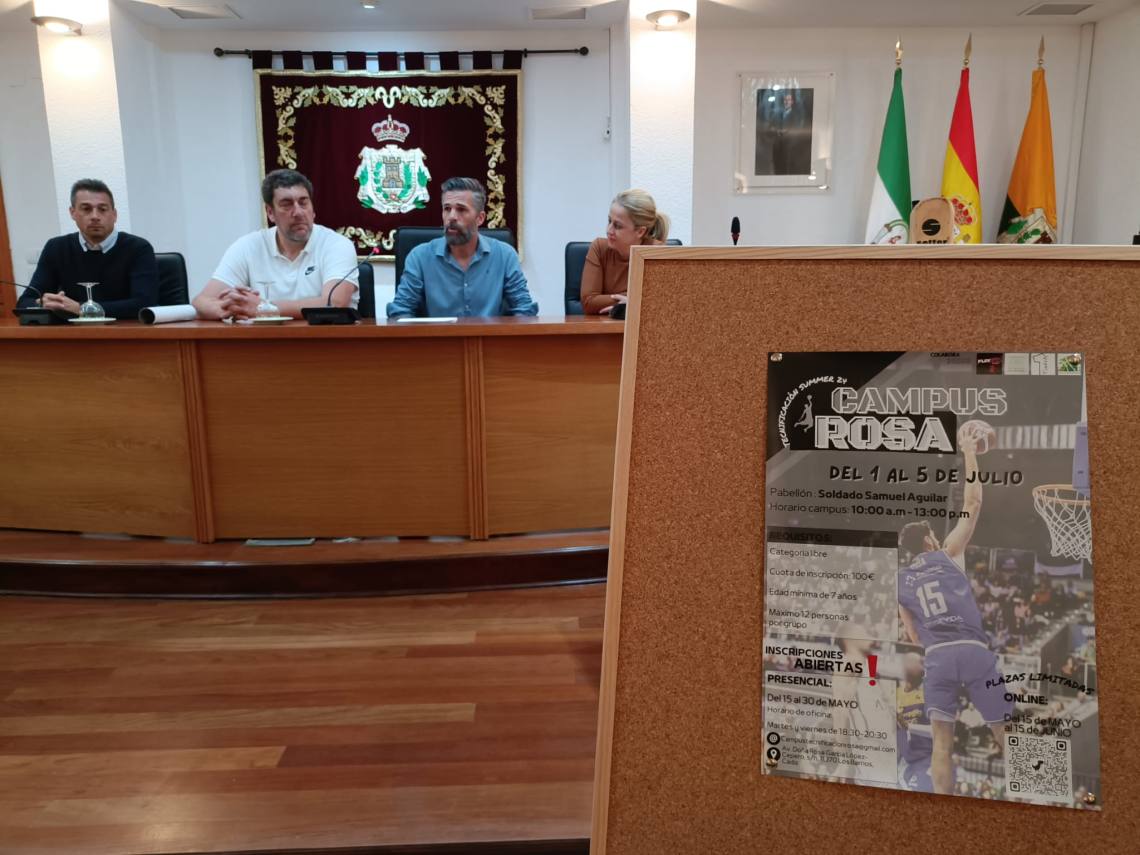 El concejal de Deportes, Rául Álvarez; y la delegada de Comunicación, May Gallego; han presentado este mediodía el Campus de Tecnificación de Baloncesto ‘Rosas’, que se desarrollará en Los Barrios del 1 al 5 de julio.