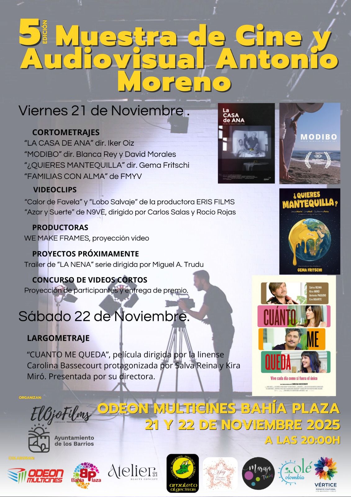La quinta edición de la Muestra de Cine y Audiovisual ‘Antonio Moreno’ tendrá lugar los días viernes 21 y sábado 22 de noviembre de 2025, con todas las sesiones programadas a las 20:00 horas en Odeón Multicines Bahía Plaza.
