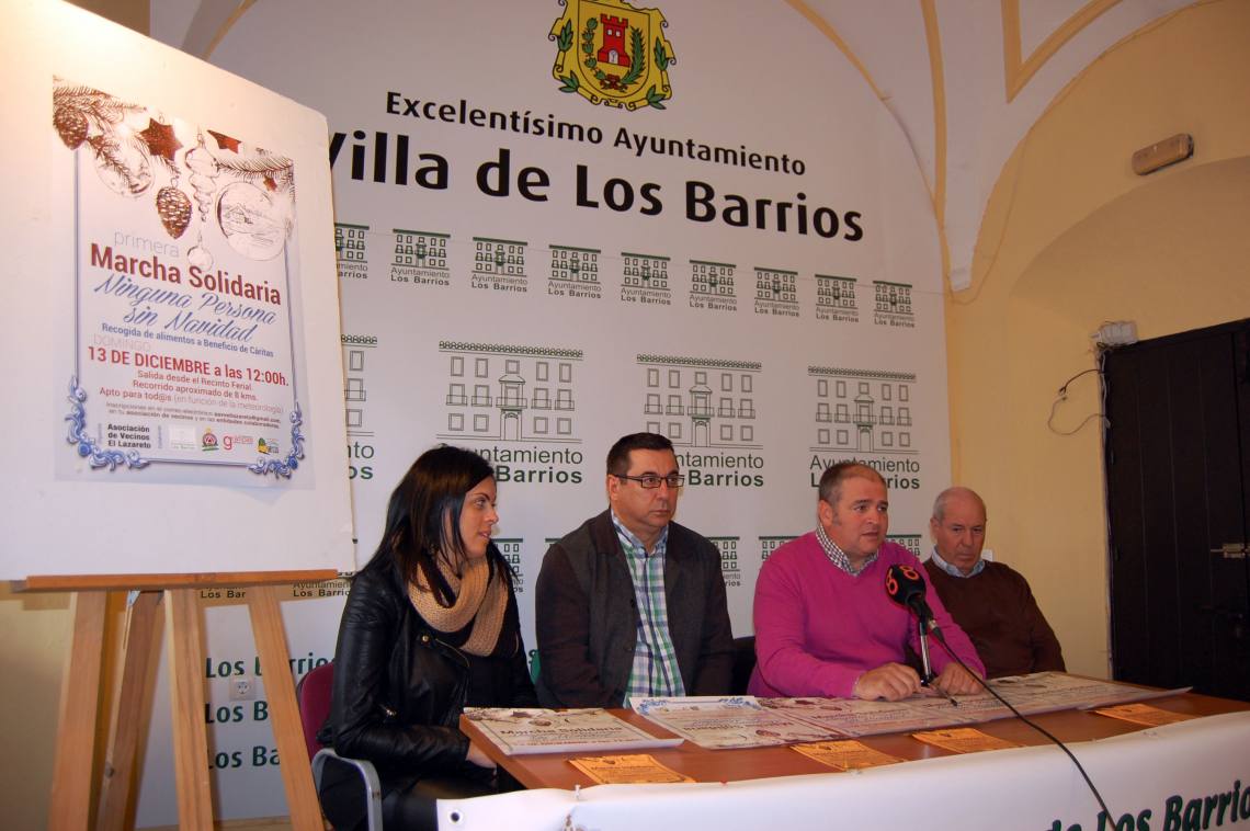 El alcalde de Los Barrios, Jorge Romero, ha presentado esta mañana en la Casa de la Cultura Isidro Gómez del municipio la Primera Marcha Solidaria ‘Ninguna Persona sin Navidad’, organizada por la AVV El Lazareto con la colaboración del Ayuntamiento y que se celebrará el 13 de diciembre con la finalidad de recoger alimentos para Cáritas Los Barrios.