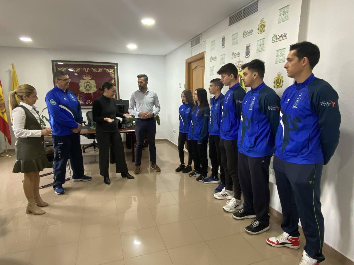 La primera teniente de alcalde, Sara Lobato; el delegado de Deportes, Raúl Álvarez, y la delegada de Servicios Sociales, May Gallego, han recibido esta mañana en alcaldía a los siete miembros de la Academia de Taekwon-Do ITF de Los Barrios que representarán a España en el próximo campeonato de Europa.