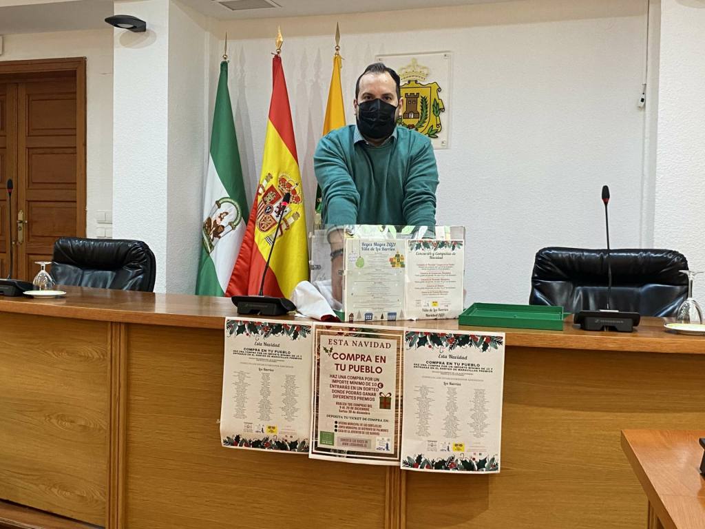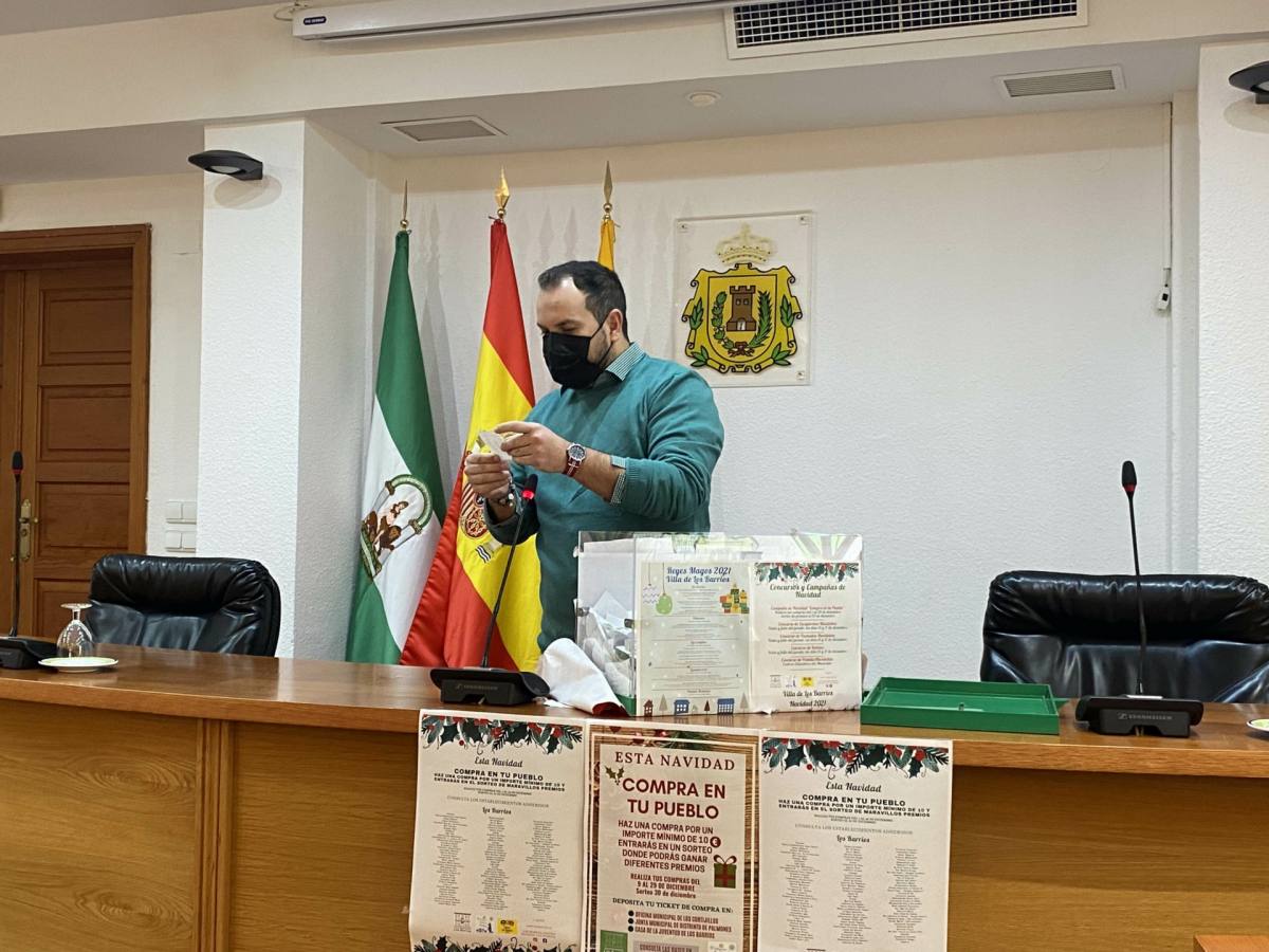 El concejal delegado de Festejos, Daniel Pérez Cumbre, ha presidido hoy en el salón de plenos de la Casa Consistorial el sorteo de la campaña “Compra en tu pueblo”, que ha tenido por objetivo promocionar el comercio local en estas fiestas navideñas de 2021.