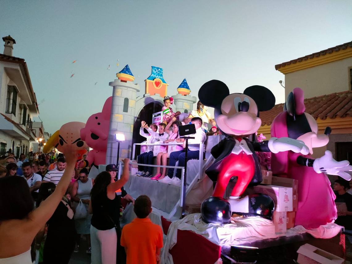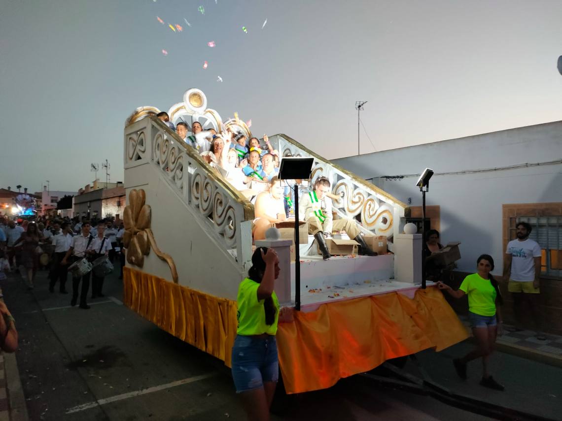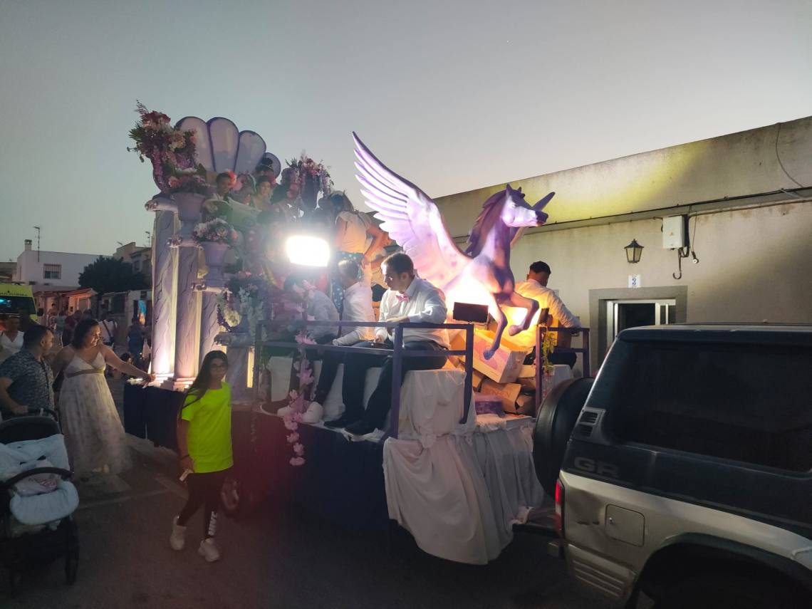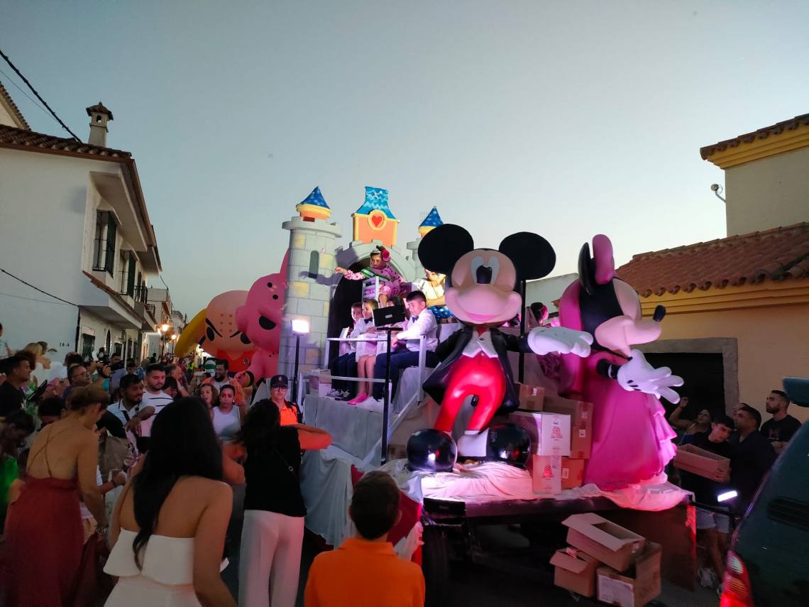 Tras la coronación se celebró una divertida cabalgata con tres carrozas, animaciones de hinchables gigantes, muchos caramelos y la banda de música y mucho ambiente de vecinos y vecinas por las calles de la barriada.