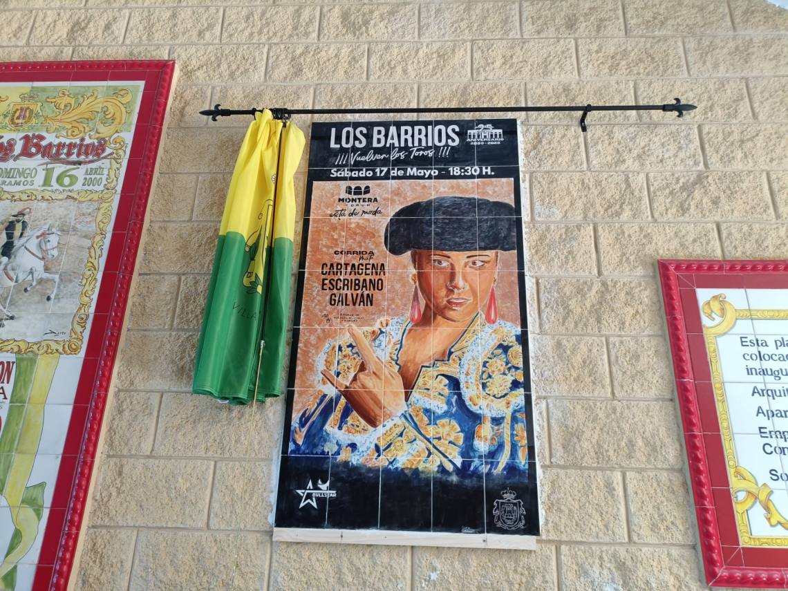 Alconchel y Medina han descubierto este azulejo en la puerta grande de la plaza, que recordará el cartel del cuarto de siglo de La Montera.