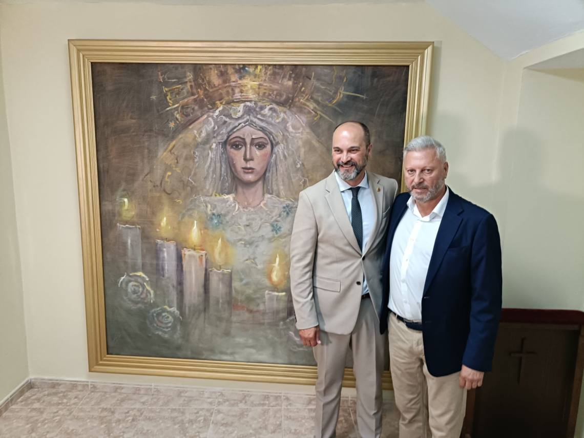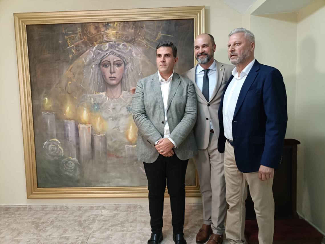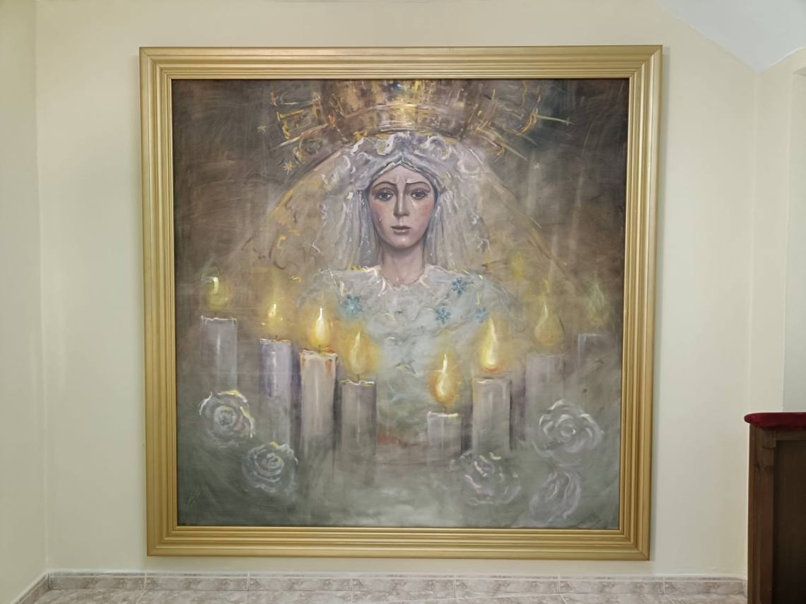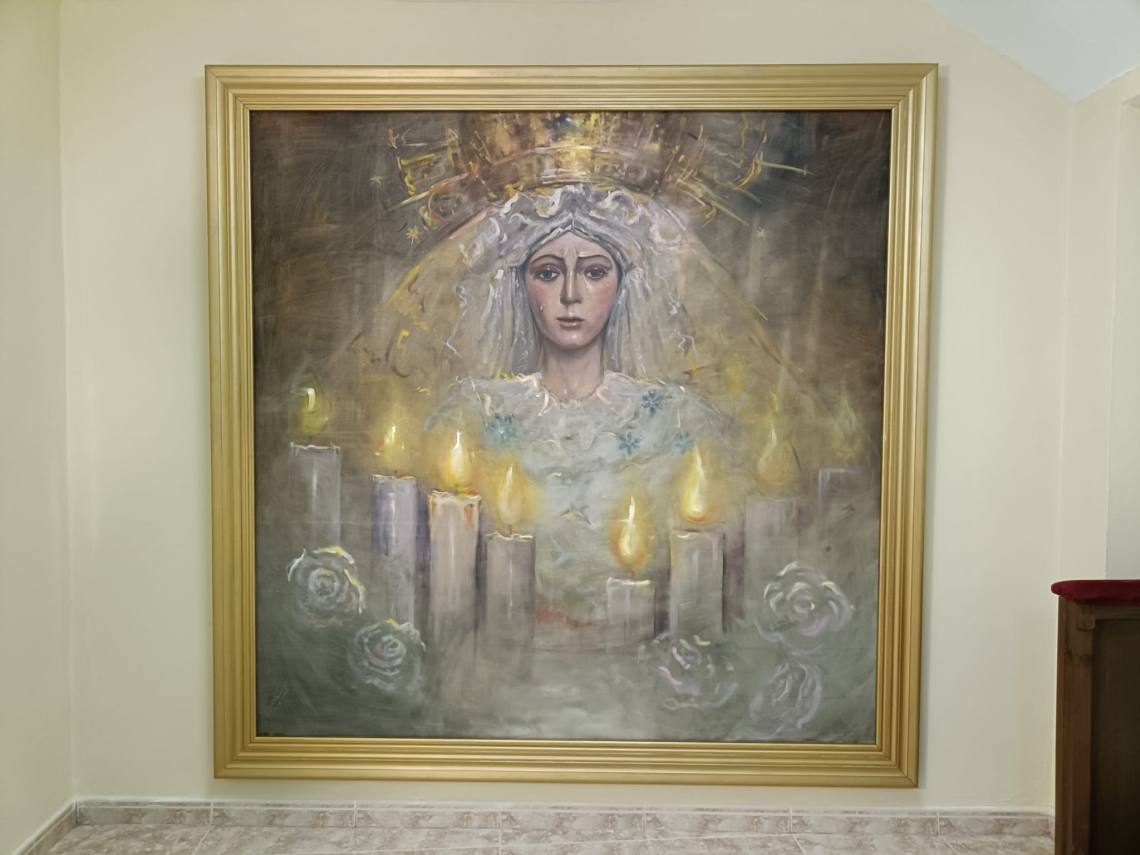 El cuadro es una pintura al óleo que refleja la imagen de la Esperanza Macarena sevillana, “una imagen naturalista, con un poco de abstracción, jugando con los tonos violetas y contrastes amarillos y con una mirada realista y con una gran expresión”, apuntó el artista Bernardo Martínez.