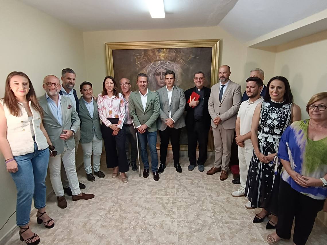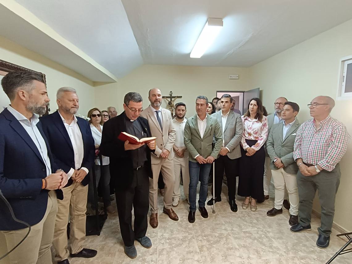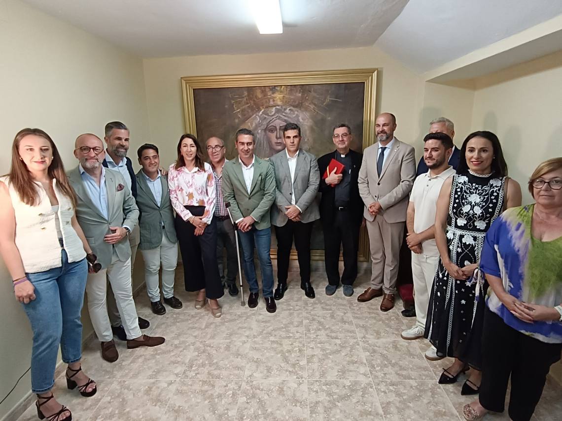 El alcalde de Los Barrios, Miguel Alconchel; el delegado de Seguridad Ciudadana, Antonio Dávila; y el edil de Obras y Servicios, José Antonio Gómez; junto a concejales del equipo de gobierno y de la Corporación Municipal y el empresario de la plaza, Juan Antonio Medina, han asistido al acto de bendición del cuadro de la Esperanza Macarena, creado por el artista local Bernardo Martínez, en la capilla de la plaza de toros de La Montera.