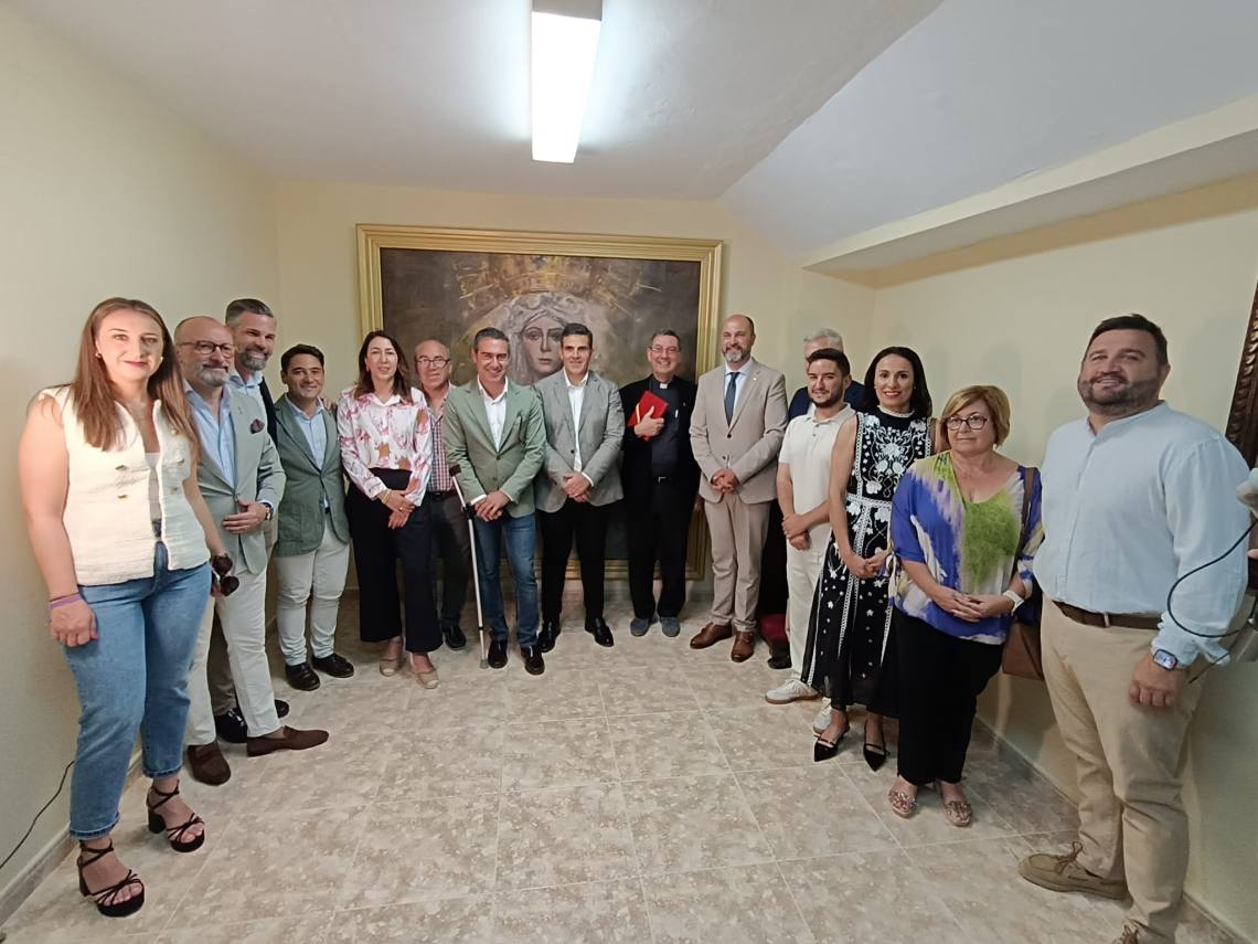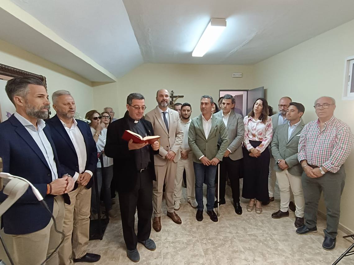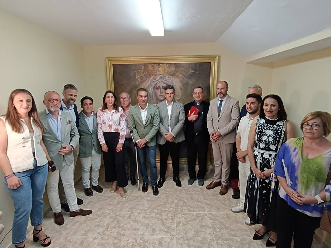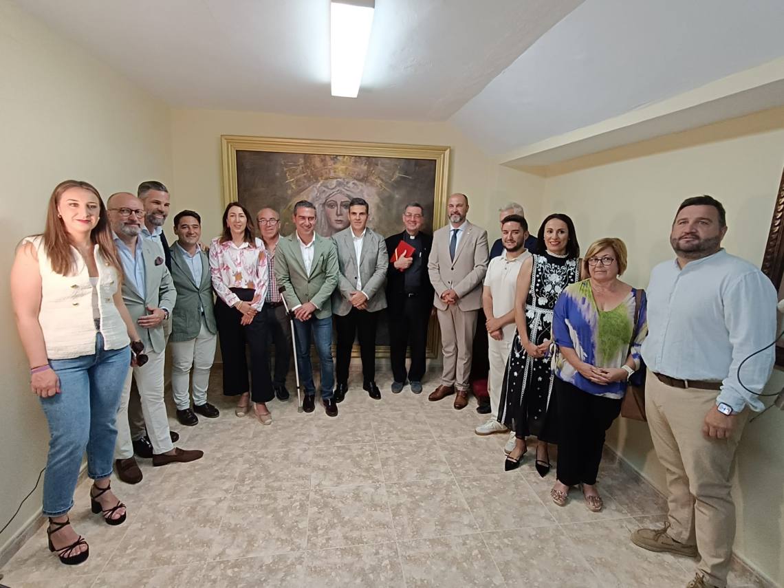El alcalde de Los Barrios, Miguel Alconchel; el delegado de Seguridad Ciudadana, Antonio Dávila; y el edil de Obras y Servicios, José Antonio Gómez; junto a concejales del equipo de gobierno y de la Corporación Municipal y el empresario de la plaza, Juan Antonio Medina, han asistido al acto de bendición del cuadro de la Esperanza Macarena, creado por el artista local Bernardo Martínez, en la capilla de la plaza de toros de La Montera.