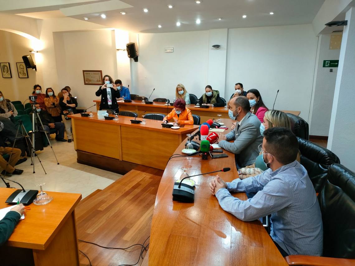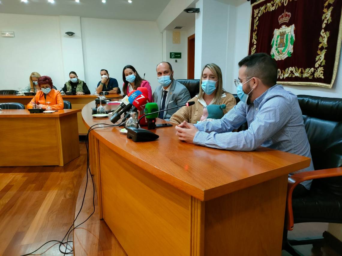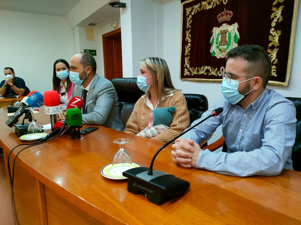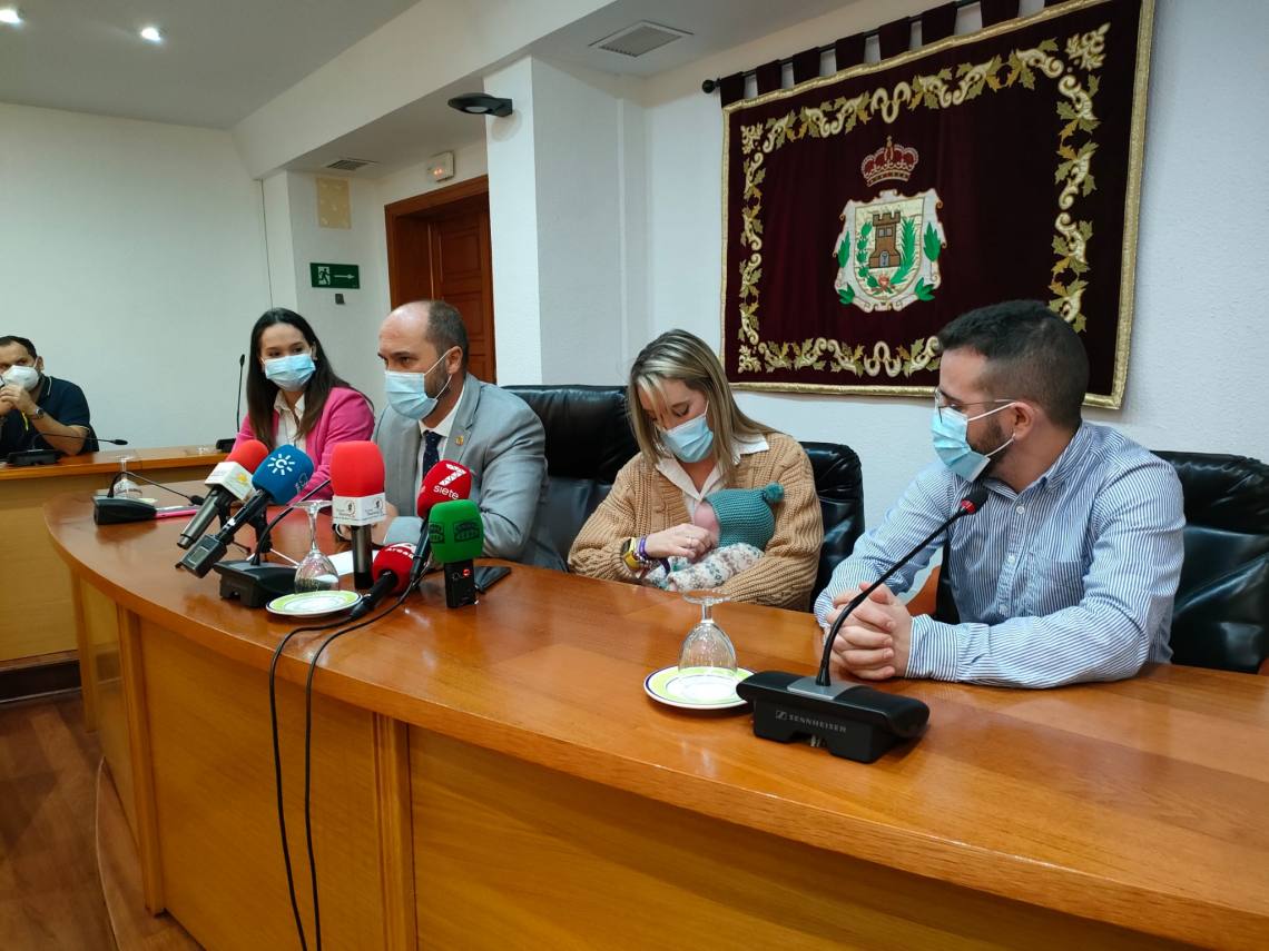 El alcalde de Los Barrios, Miguel Alconchel, y la primera teniente de alcalde, Sara Lobato, han ofrecido una rueda de prensa esta mañana junto a los padres de Valentina, una bebé de cinco meses y medio que sufre una enfermedad rara, en concreto una polineuropatia hipomializante congénita tipo 3.